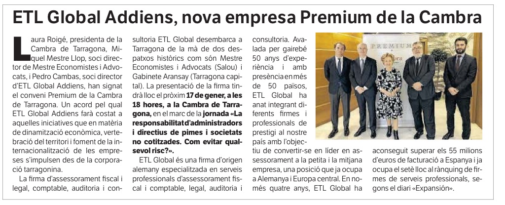 Tras la firma del convenio entre Laura Roigé, presidenta de la Cambra de Tarragona, Miquel Mestre Llop, socio director del Mestre Economistas i Advocats y Pedro Cambas, socio director de ETL Global Addiens, el despacho pasa a ser nueva empresa premium de la Cambra de Tarragona. El siguiente artículo recoge la noticia.